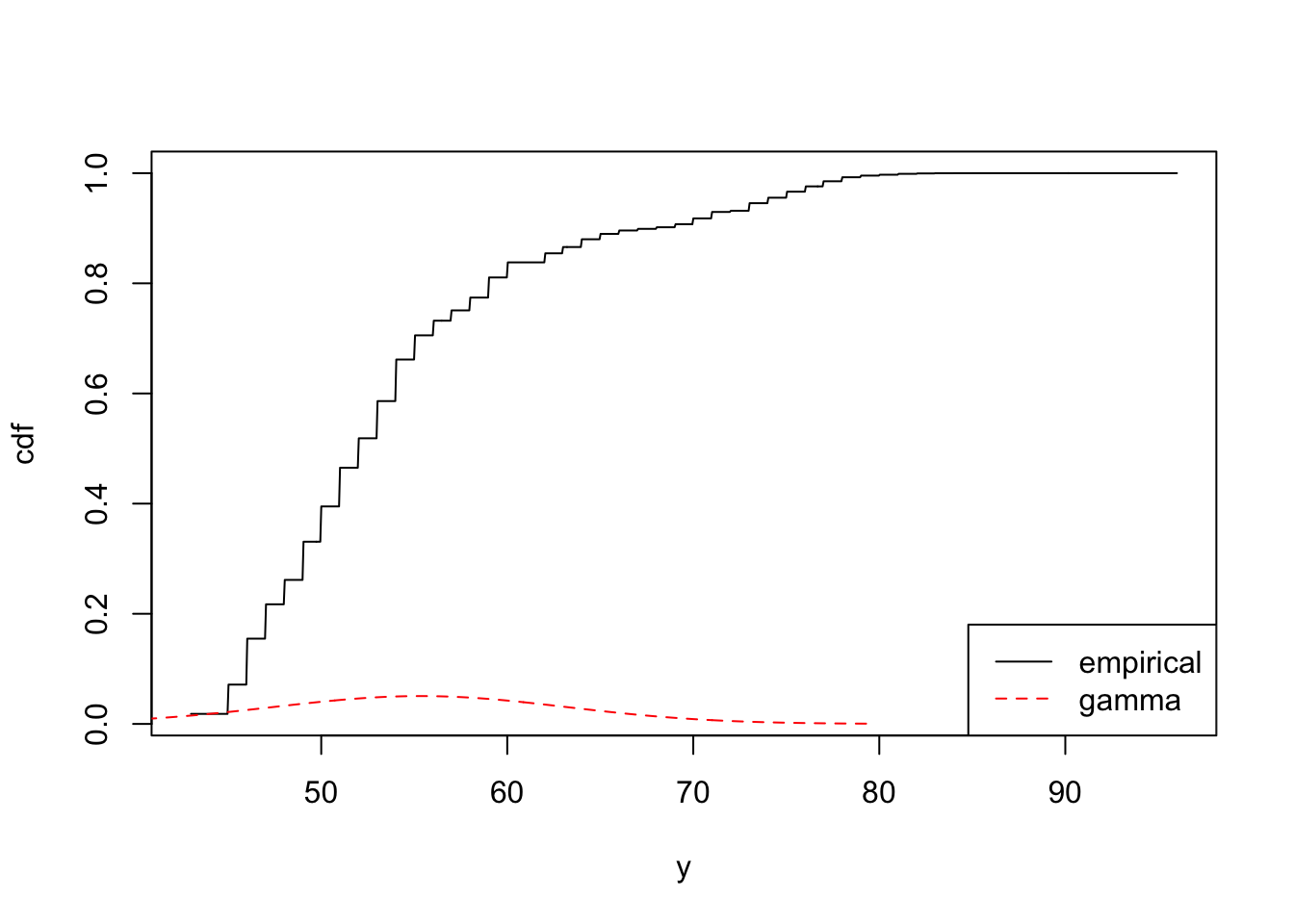 x <- faithful$waitingWe can use distionary to create an empirical (data-based) distribution, and famish to fit a gamma distribution to the data.